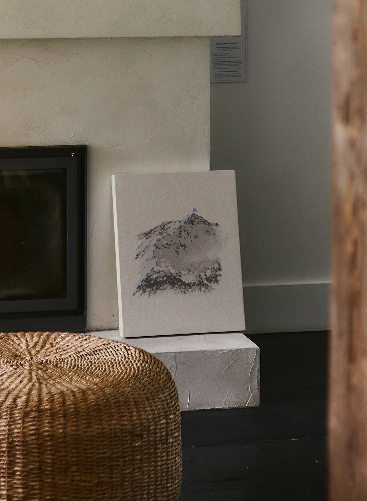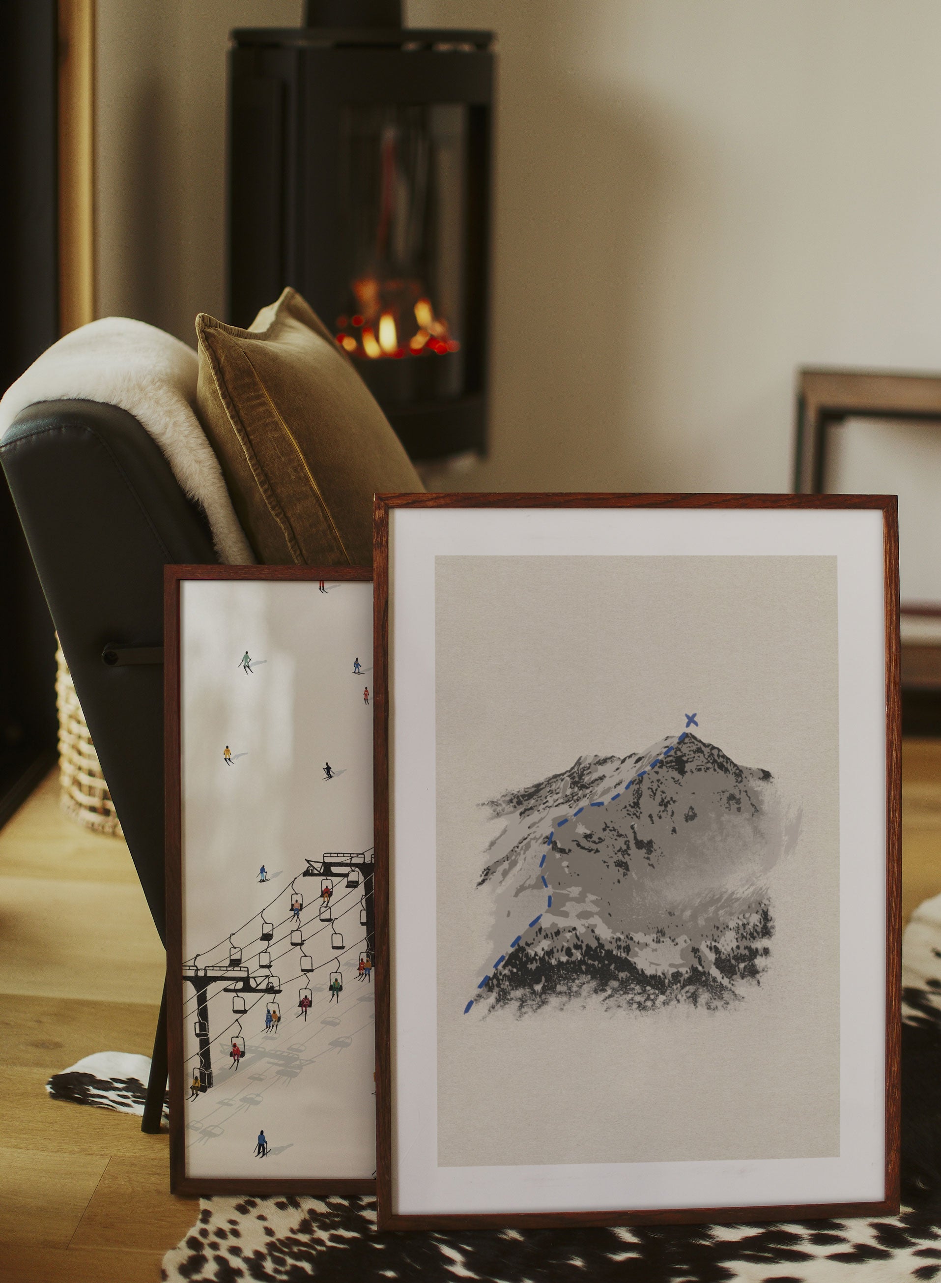 The best part of getting 'All the Way to the Top'? Skiing all the way down! This minimalist illustration shows a snowy black and white mountain summit with a dotted blue line and an 'x' marking the highest altitude.
