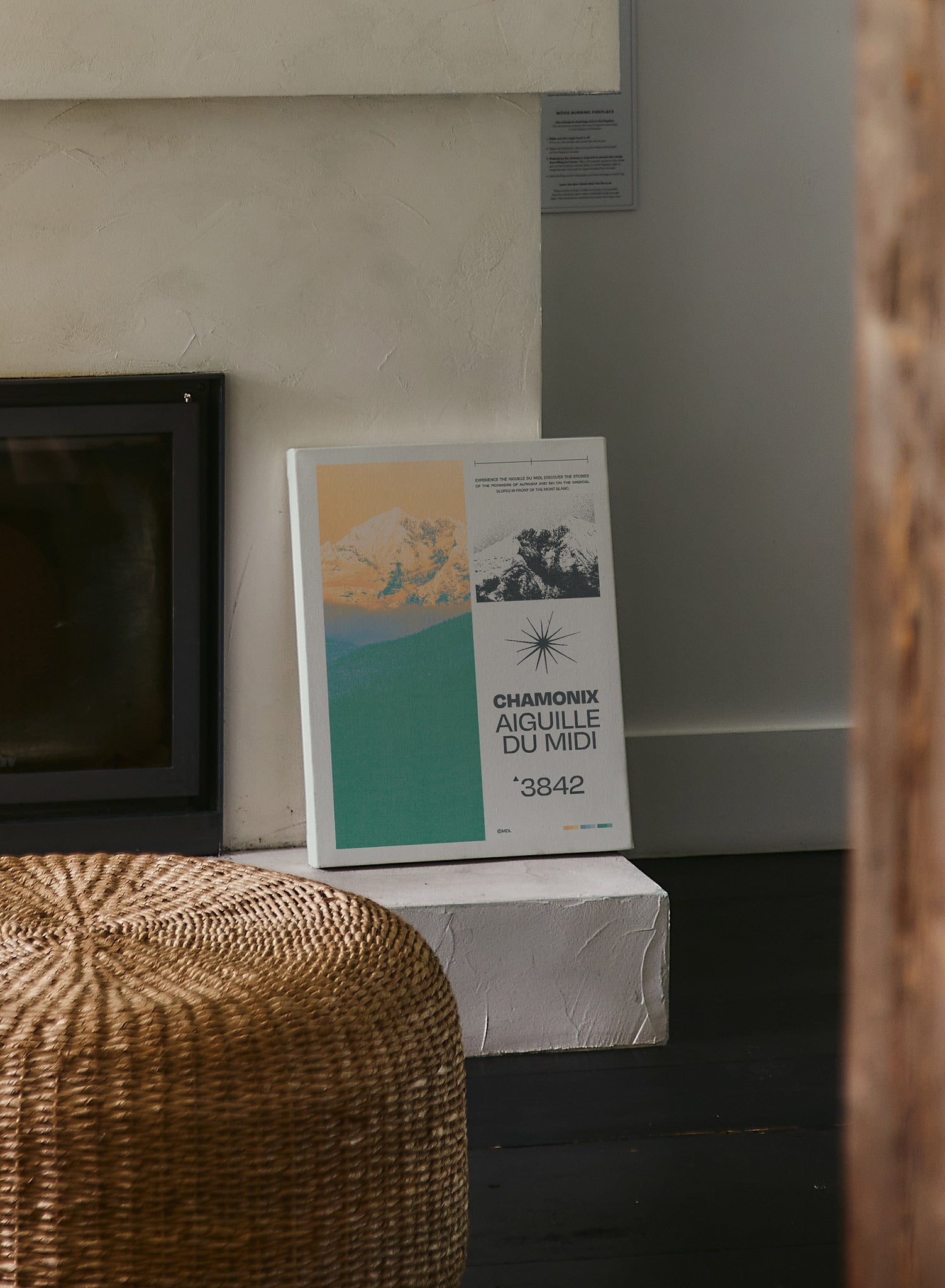 The 'Midday Needle' or 'Aiguille du midi' is a 3842 meter high mountain in the Chamonix region of the Alps. Until you can visit this iconic ski destination, enjoy this vintage poster showing the mountain under stunning orange sunset lighting.