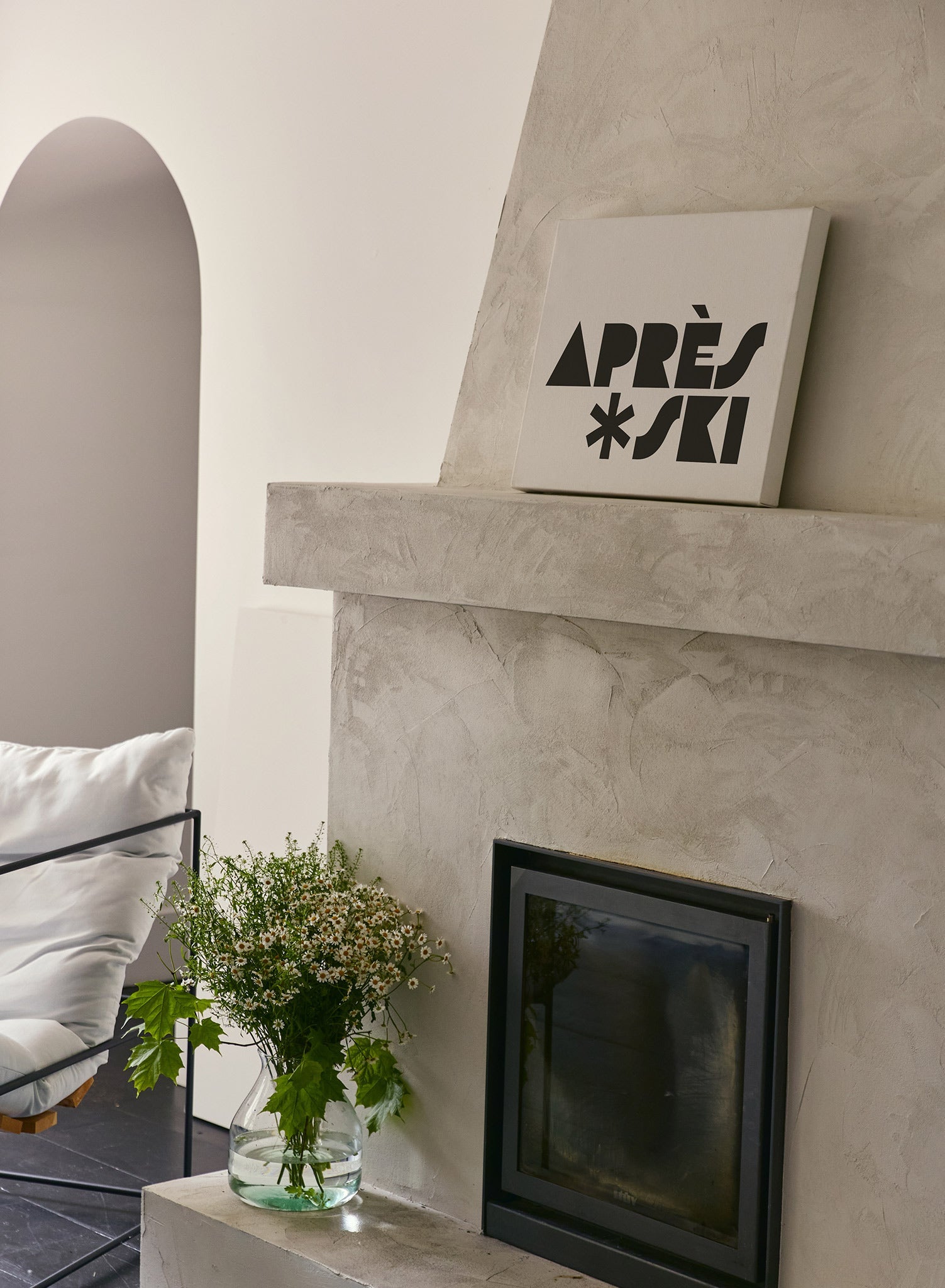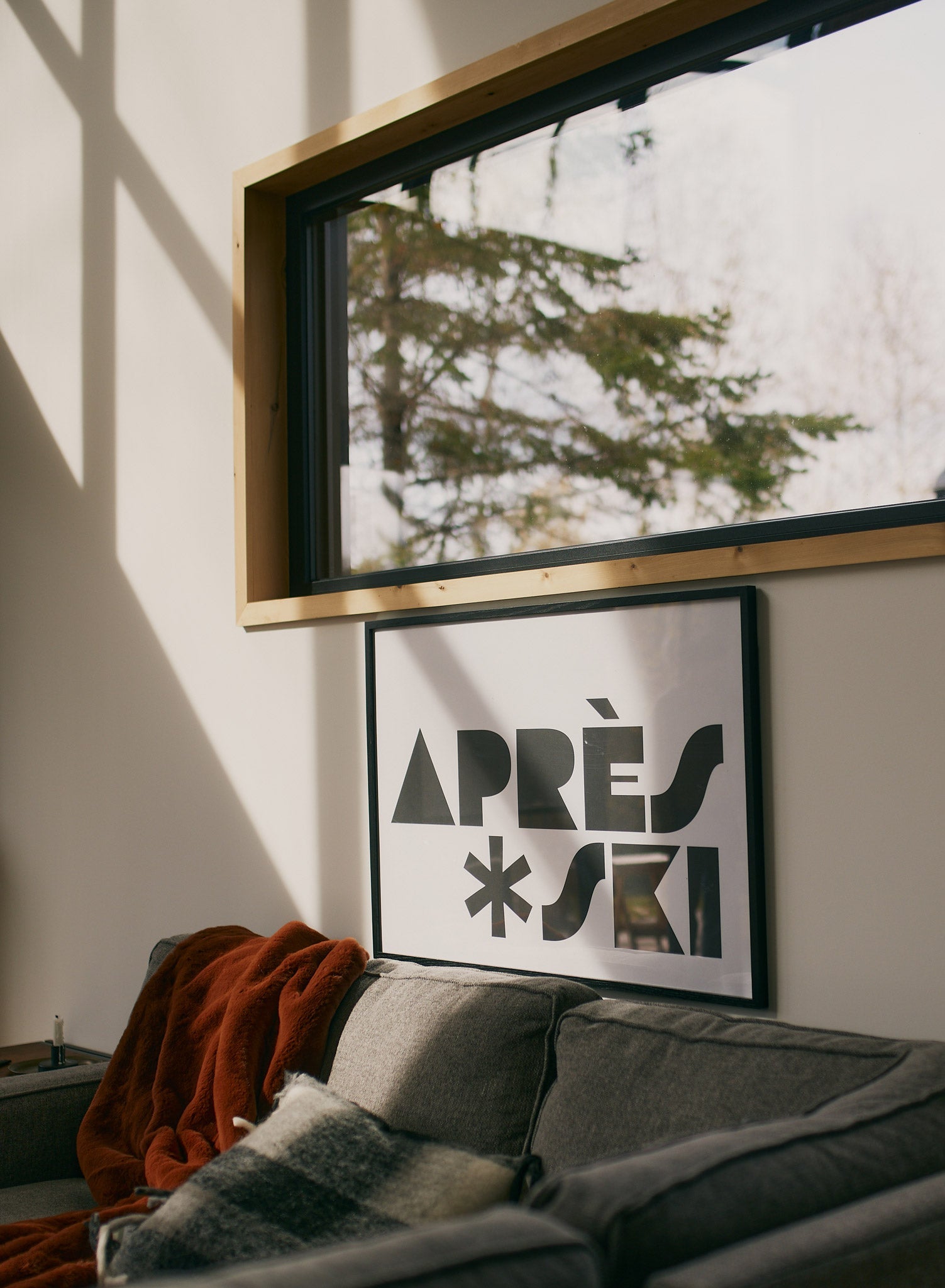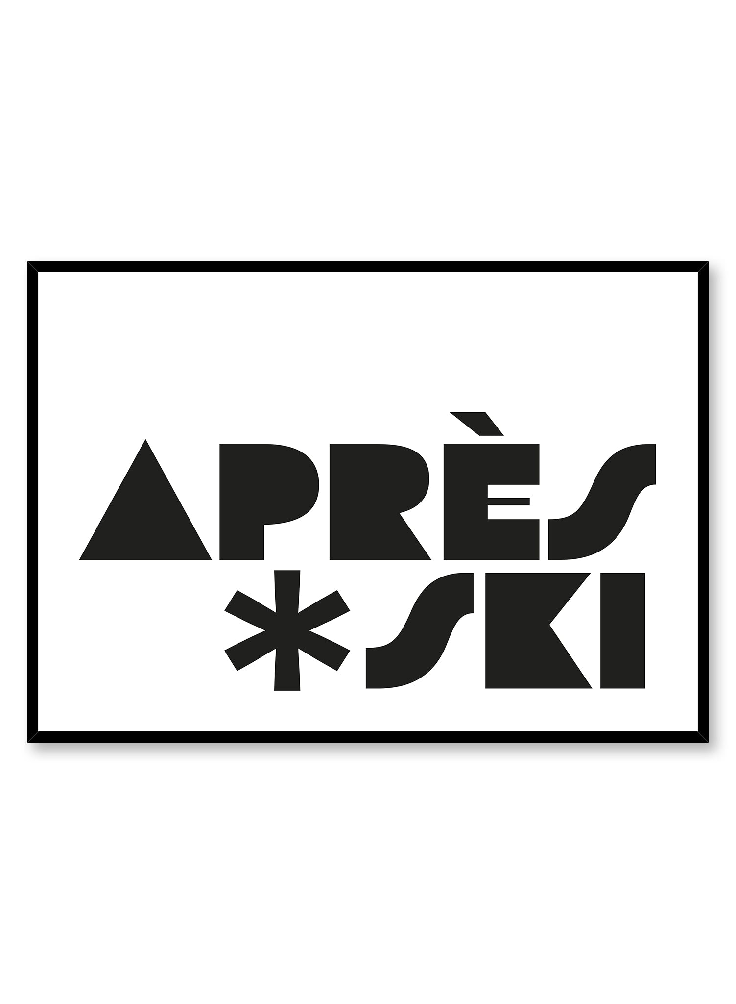 After a day of sweating on the slopes, you can always find us winding down with a beer at the 'Reward Station'! This horizontal poster features the words 'Après Ski' in black typography over a light grey background.